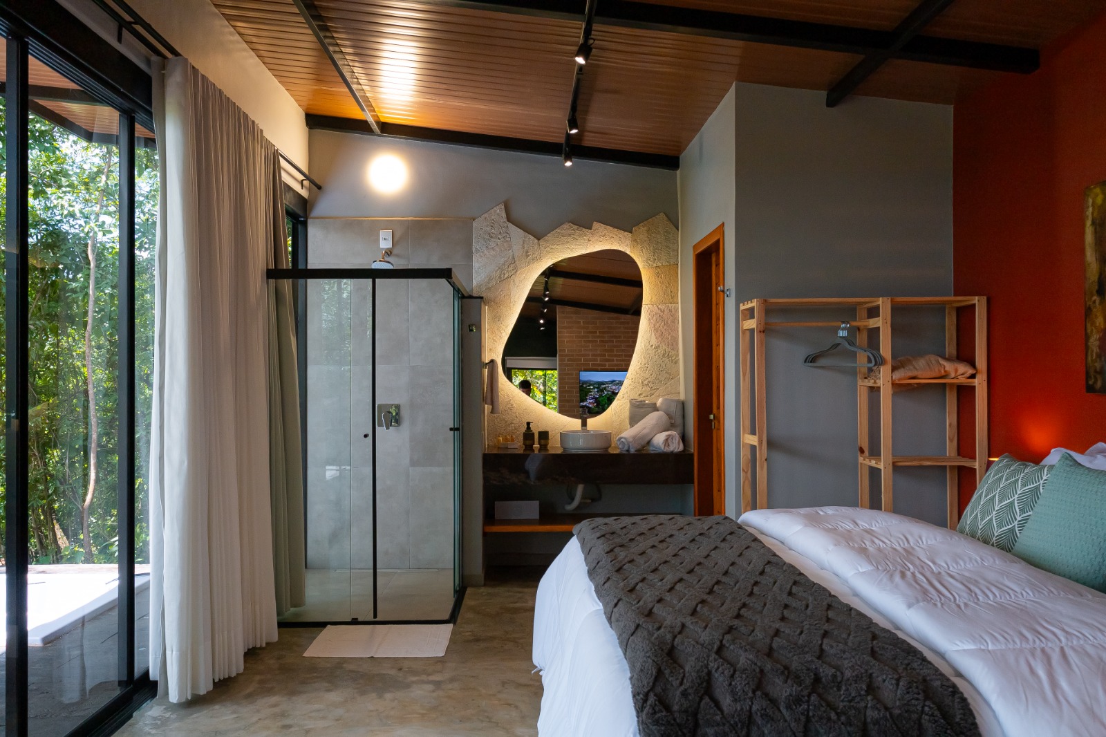 A propriedade ao redor pertence integralmente a nós, mas os chalés foram projetados para oferecer um ambiente totalmente reservado, garantindo uma estadia exclusiva e tranquila.